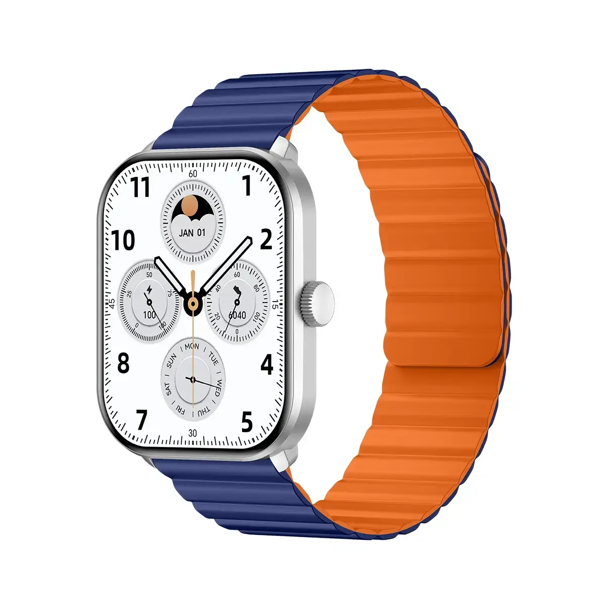 ساعت هوشمند، بند مغناطیسی (یا استیل مغناطیسی)، بند سیلیکون مایع، محافظ صفحه نمایش، کابل شارژ مغناطیسی، دفترچه راهنما، کارت گارانتی