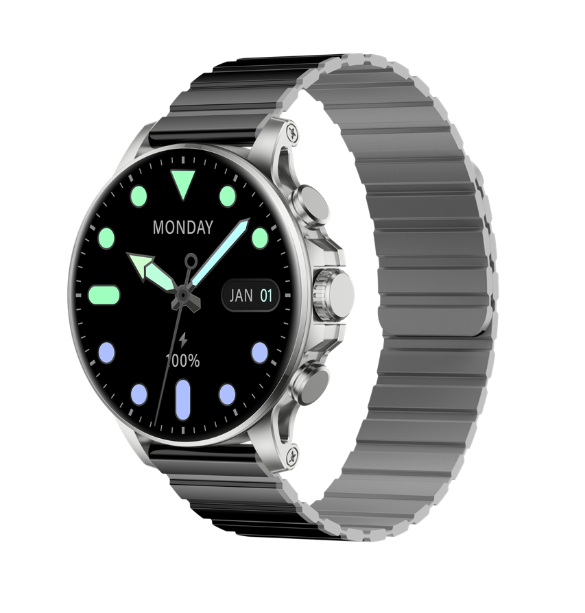 برای اتصال بندها از پیچهای تزئینی استفاده شده که به ظاهر ساعت جلوهای مدرن و جذاب میبخشد. در بستهبندی، دو بند استاندارد 22 میلیمتری شامل یک بند مگنتی و یک بند سیلیکونی قرار دارد که امکان تغییر استایل را به راحتی فراهم میکند.