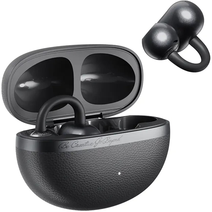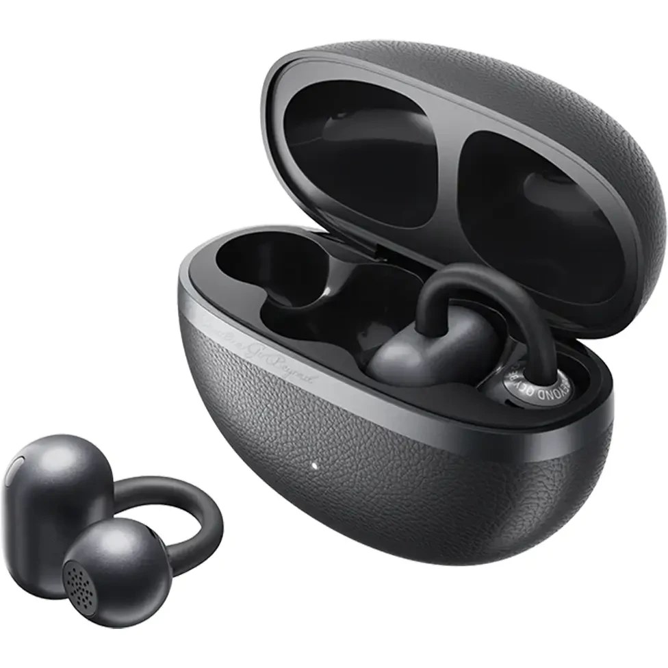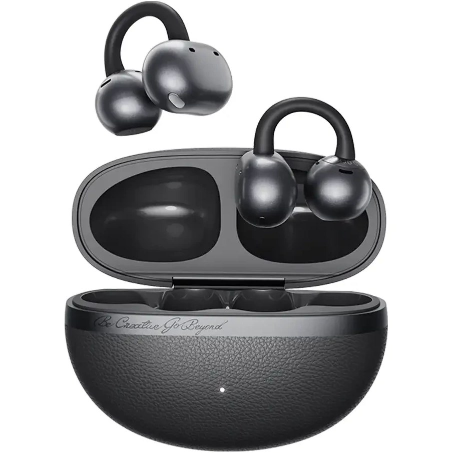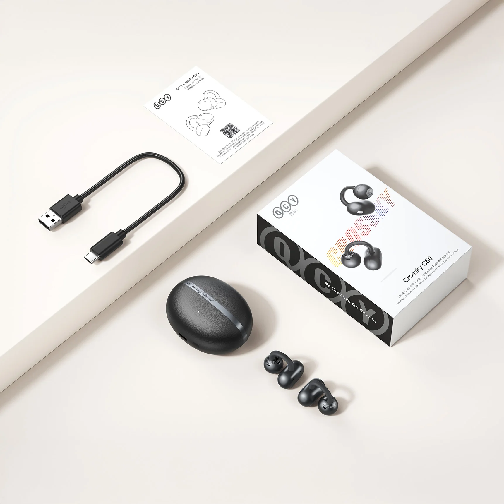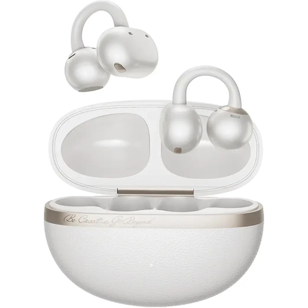 Crossky C50 از فرم open‑ear / clip‑on بهره میبرد؛ به این معنا که هدفون روی لاله گوش قرار میگیرد و بهجای ورود کامل به کانال گوش، آزادی عمل بیشتری برای کاربر فراهم میکند. این طراحی باعث راحتی بالا حتی در استفاده طولانیمدت میشود و در عین حال امکان شنیدن صدای محیط اطراف را حفظ میکند. بدنه هدفون با ترکیب سیلیکون نرم و آلیاژ سبک طراحی شده و به خوبی روی گوش ثابت میماند، حتی در هنگام فعالیتهای ورزشی یا حرکت زیاد. کیس شارژ با طراحی مدرن و ظاهری جذاب، تکمیلکننده تجربه کاربری است و استاندارد IPX5 مقاومت در برابر تعریق و پاشش آب را فراهم میکند.